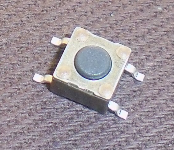 If you were paying close attention during the old button removal, you'll notice that the leads were pretty much vertical. The buttons I had on hand were very similar in size and function (normally open, leads paired length-wise); however, their leads were gull-wing SMD style (MOUSER link). Before I can install it, I need to manipulate the leads into a more vertical configuration, detailed in pictures below.